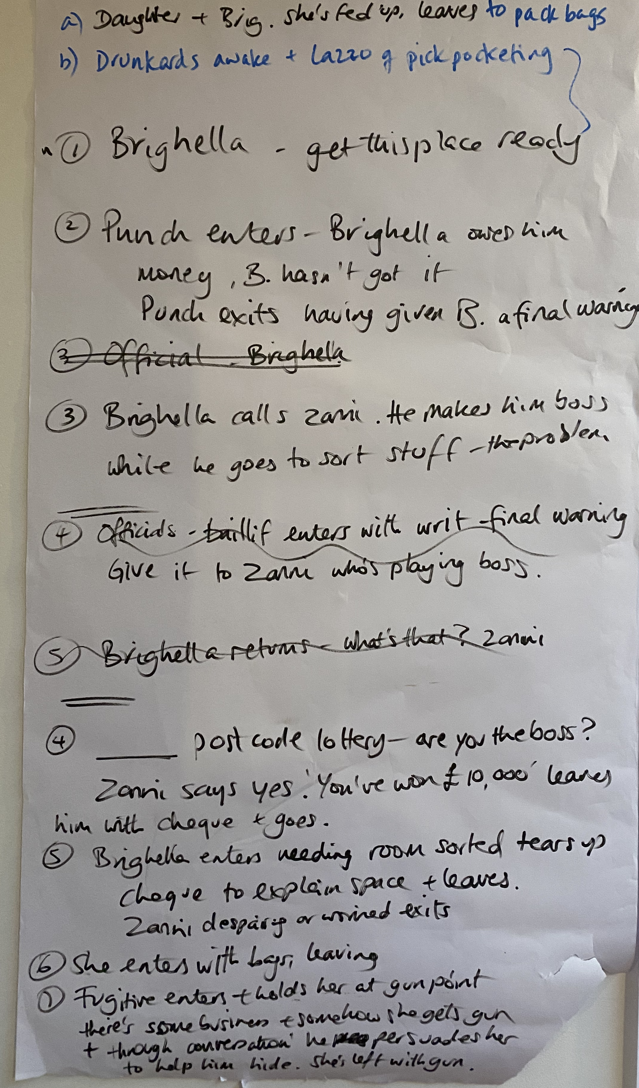 We then dedicate a day to shaping a possible frame for the action, known in Commedia as a canovaccio. Literally meaning ‘canvas’, this was traditionally an outline of scenes, entrances and exits, and key action points. Actors knew the order of events and what needed to happen, but not how, leaving space for invention